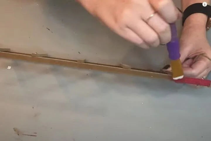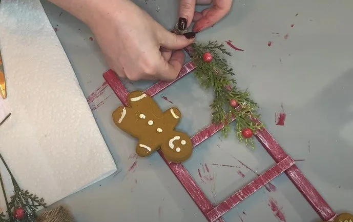 Once the white paint has dried, we are ready to secure our gingerbread cookies! I got these gingerbread in a pack from Michael’s craft store when they had their Christmas decor out last year. I’m applying hot glue first to where I would like the gingerbread to go on the last and the second to last rung of the ladder and then I will adjust the placement once it is on the hot glue. By gluing in two places, I feel the gingerbread has less chance of coming off the ladder.
