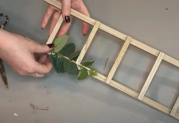 The floral pieces I’m using did not look quite as polished when I first held them up against the ladder so I realized that wrapping some twine around the bottom of the floral pick bunches made it look more farmhouse and neat. It also helped them adhere better to the ladder.