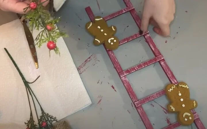 When you have both of your gingerbread hot glued to the ladder, next it’s time to add some holiday themed greenery. I got this floral pick from Dollar Tree when they put out all of their winter themed floral pieces. It’s sparkly/glittery so please keep that in mind as it may get glitter all over your workspace but for the most part, the glitter did stay intact surprisingly well.