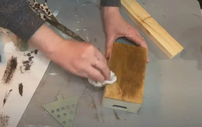 Next, we are going to get the base of the tree prepared by using antique wax on this wood crate I found at Dollar Tree in their Crafter’s Square section. It’s a plain wood box with no coating so it’s easy to apply some antique wax to. However, I don’t want the wax to come out looking tooooo dark because it certainly can if you don’t dilute it and apply it as is. I personally use a makeup or baby wipe as you can see in the photo above to apply it to the wood crate. I recommend wearing gloves while applying antique wax as it can be difficult to get off of your hands if you wait too long. Cover the crate in the wax using the baby wipe and free free to apply more as you go if it looks too light in color.