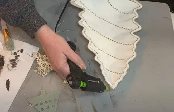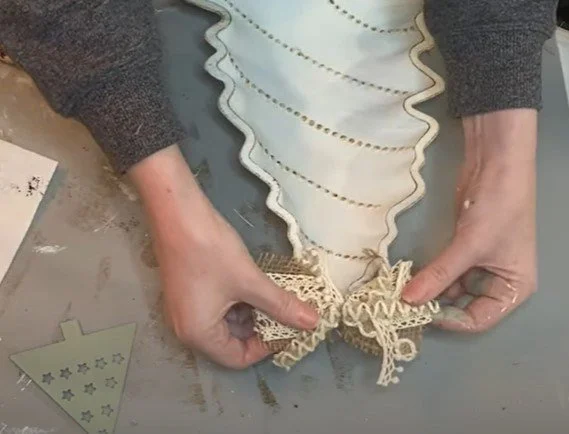 Once all the antique wax had dried, I decided to go ahead and glue a fabric/ribbon bow on the very top of the tree dish as the “star” of the tree.