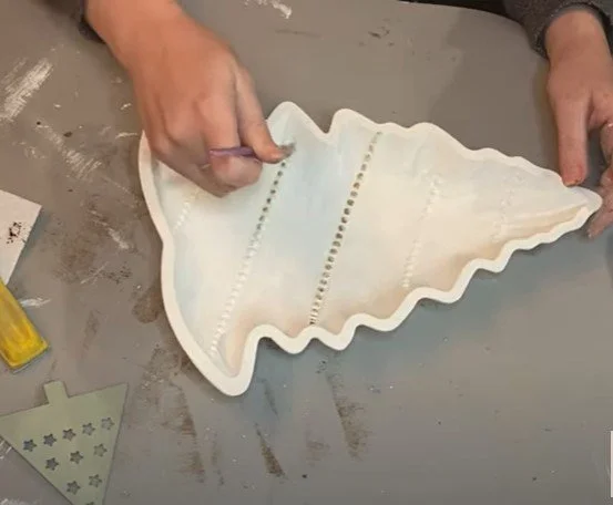 Once the paint is dry, you can either take some diluted brown paint. (Dilute by doing half water and half brown paint.) Or, you can use Waverly antique wax and get the excess off using a paper towel before you use it on the candy dish. I used a tiny brush with a small amount of antique wax and brushed it over the bumps in this candy dish. Do this for all or some of the bumps on the tree dish. The bumps are supposed to look like a garland!