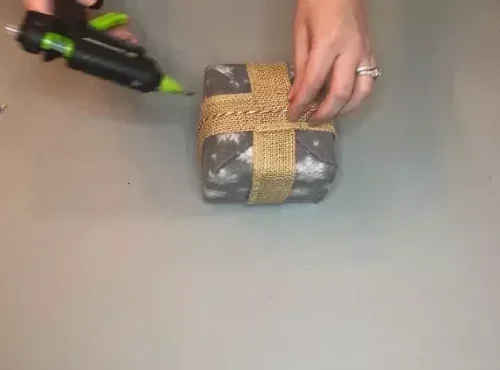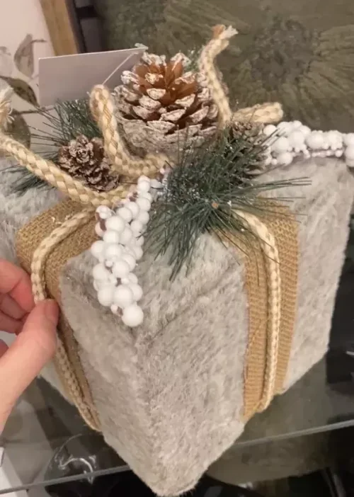 Once all the burlap was glued down on four sides, I tried gluing red and white string to the present to match the original. Hobby Lobby used white and burlap color shoestrings!