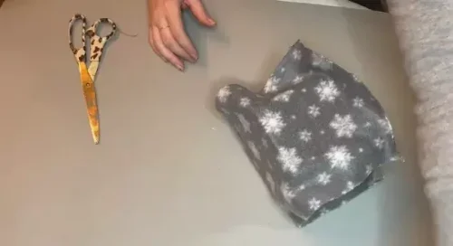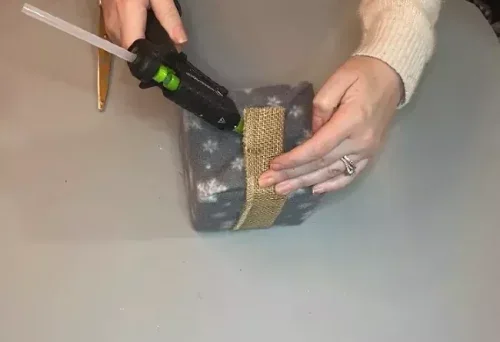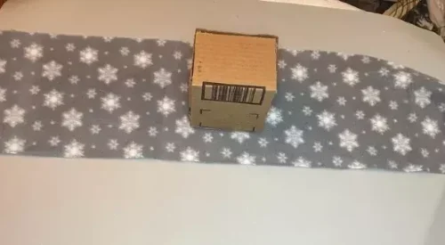 Next, lay your box on your felt or fur of choice! I decided to hot glue the scarf to every side of the box