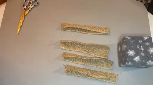 After the present was wrapped, I started cutting out 4 burlap ribbons that would fit the present from top to bottom.
