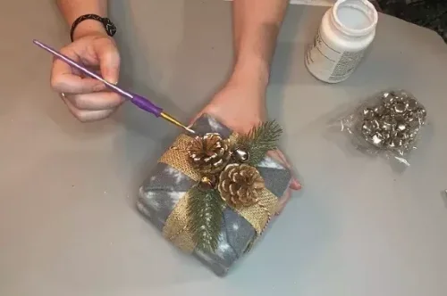 Once everything was added to this faux present, I realized it would look weird to have only a tiny bit of snow appearing on the pine cones so then I fully committed and painted them all.