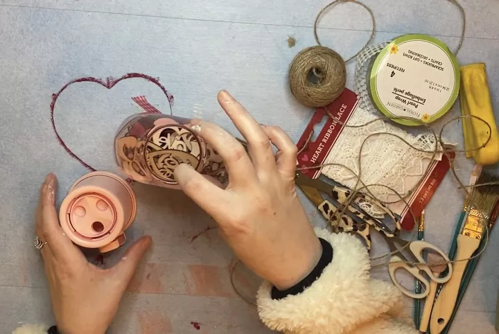 After that, I filled the lid of the gumball machine with all kinds of those small wooden Dollar Tree Valentine's Day cutout fillers.
