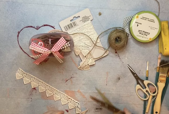 Last but not least, I wrapped some jute twine around the base of the lid of the gumball machine and hot glued it in place in the back where you can't see it. And for the finishing touch, I used the nee heart-shaped lace that Dollar Tree sells as part of their new Valentine's Day decor. I cut off the top layer of this lace so it was just the hearts strung to one another so it would fit perfectly to the base of the gumball machine.